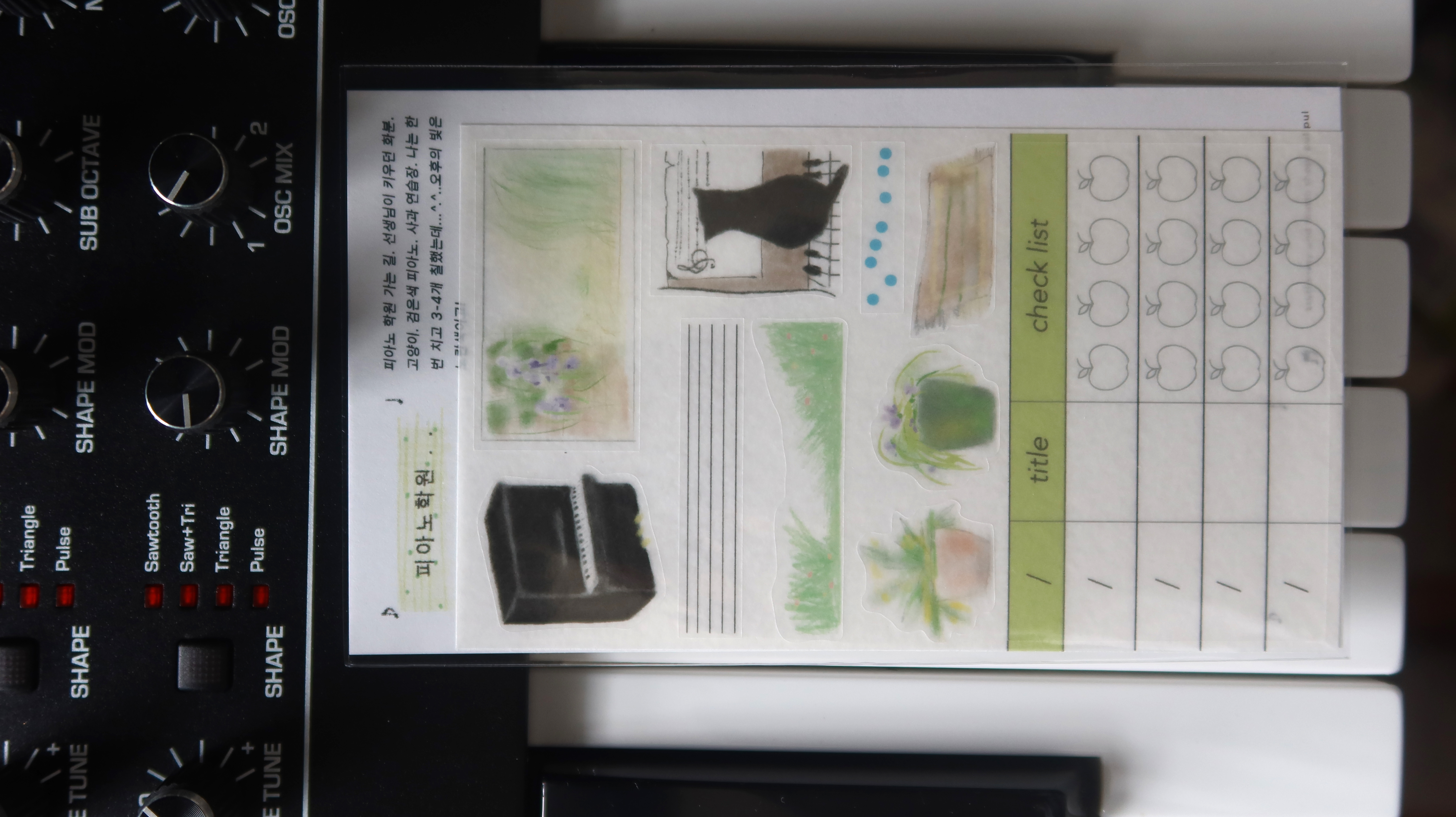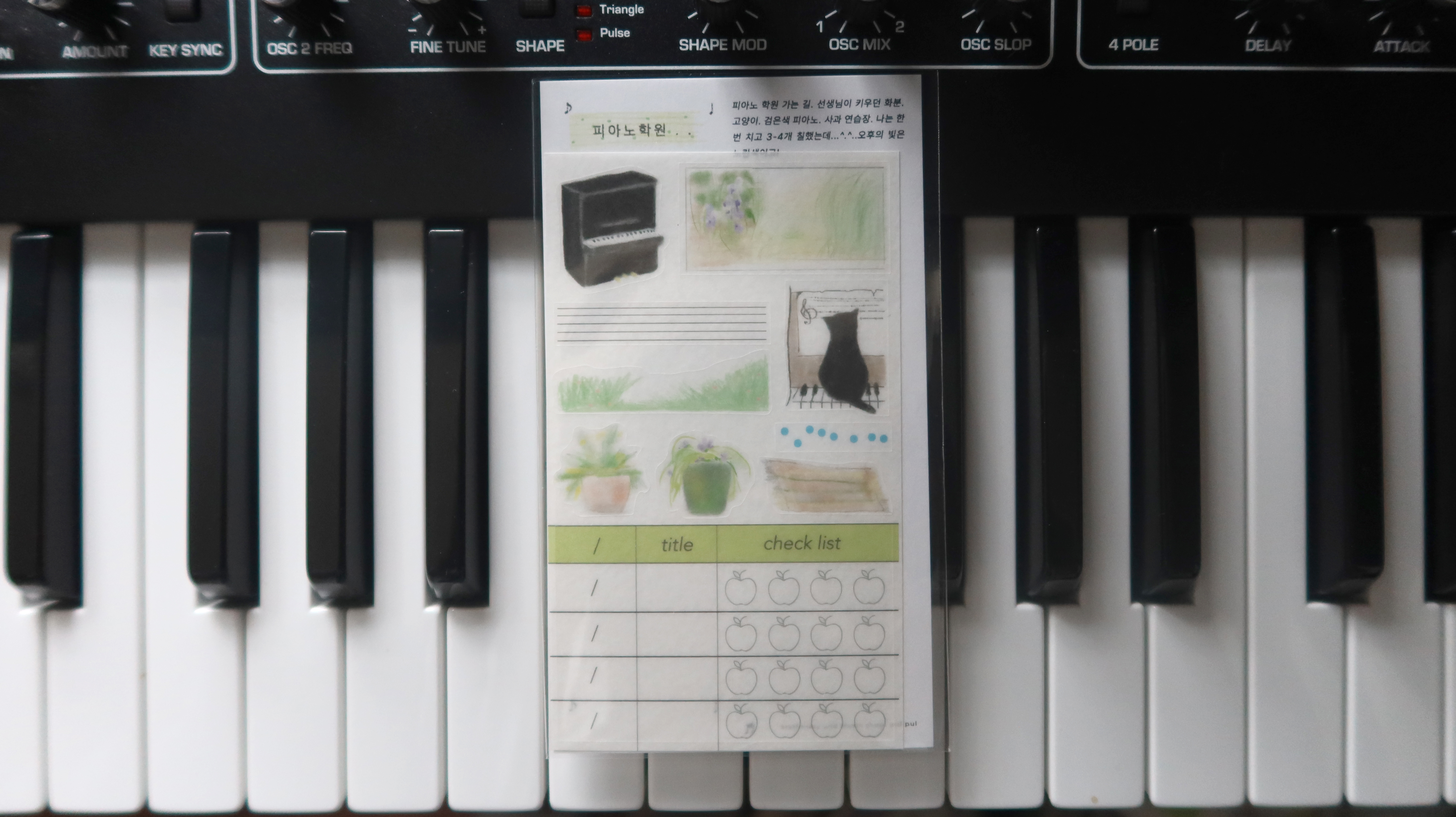 고양이. 검은색 피아노. 사과 연습장.