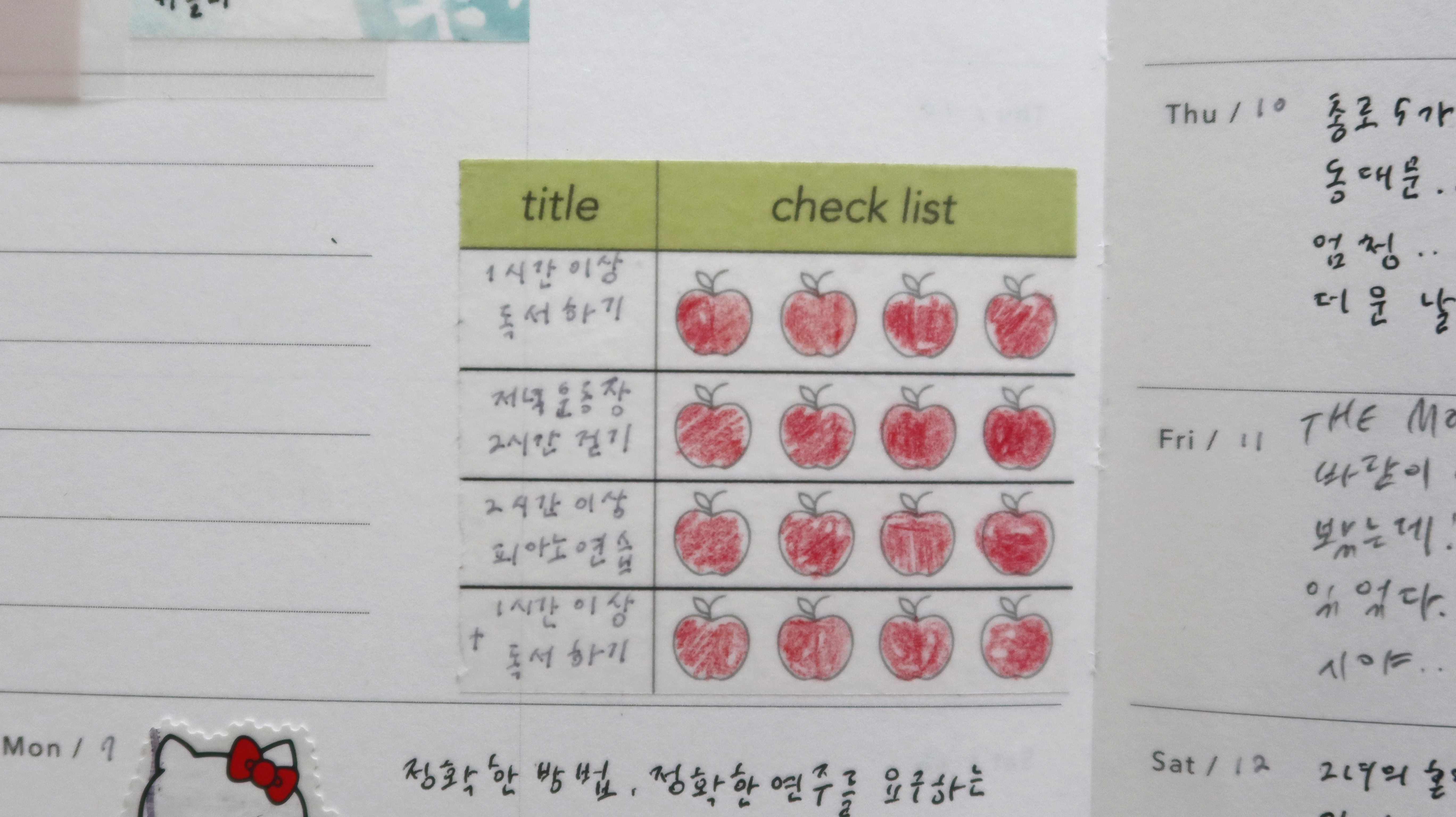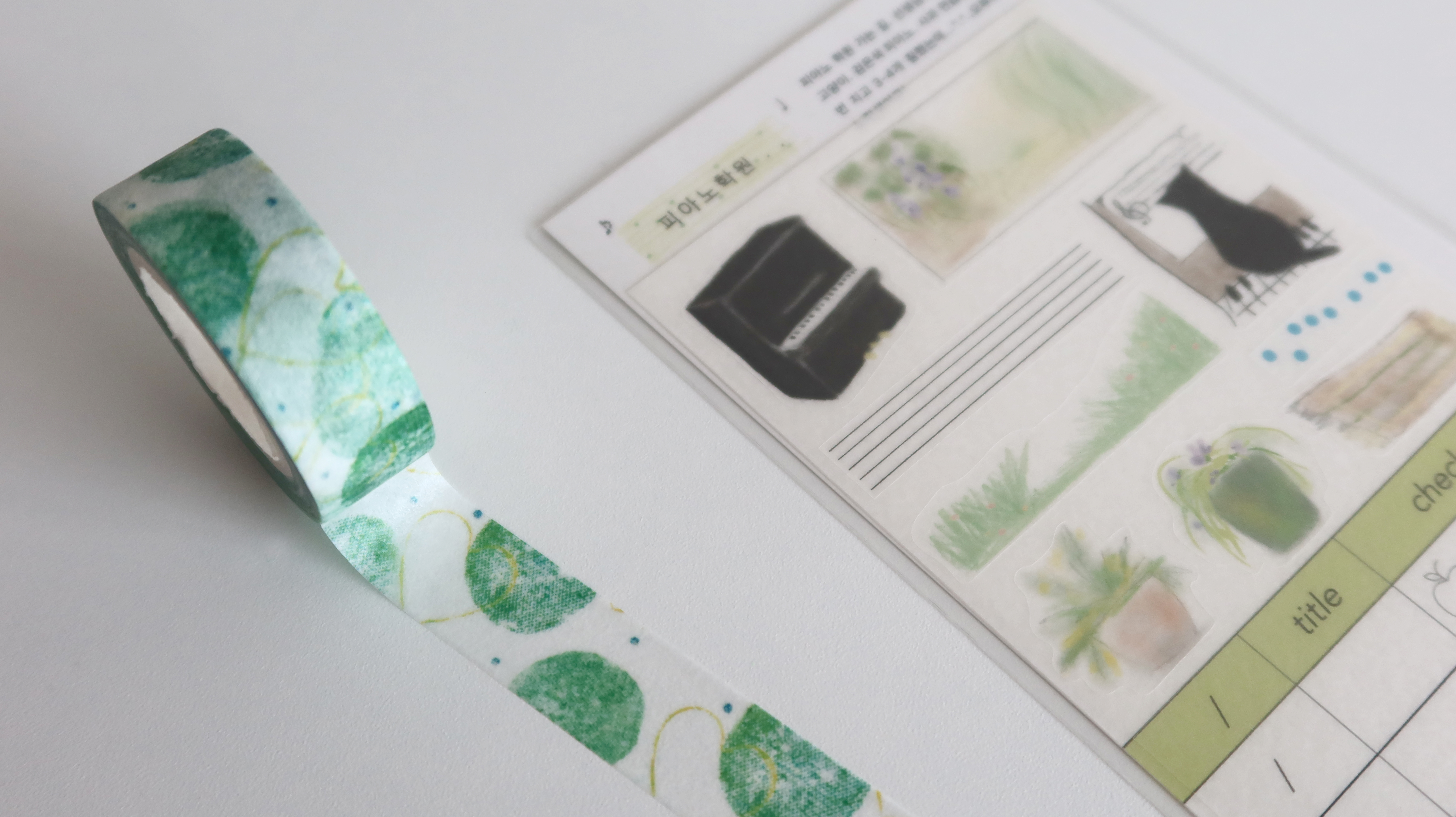 마스킹 테이프 재질의 스티커로 하얀 바탕 노트에 예쁘게 표현됩니다.